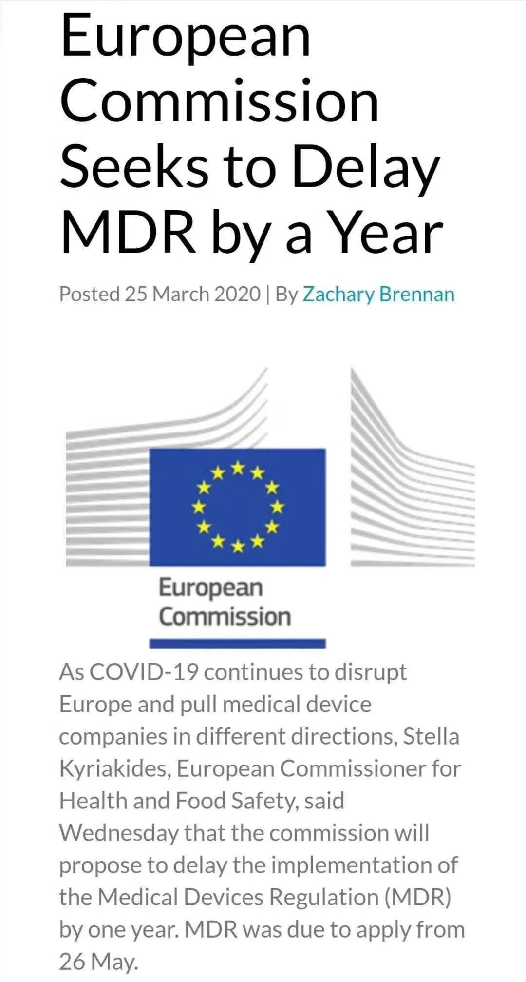 欧盟新法规MDR原计划于今年5月26日正式实施。但是因为新型冠状病毒打乱了很多医疗器械制造商的计划,欧盟卫生和食品安全委员Stella Kyriakides在周三表示委员会提议将推迟一年实施MDR,并且将在4月份进行确认。