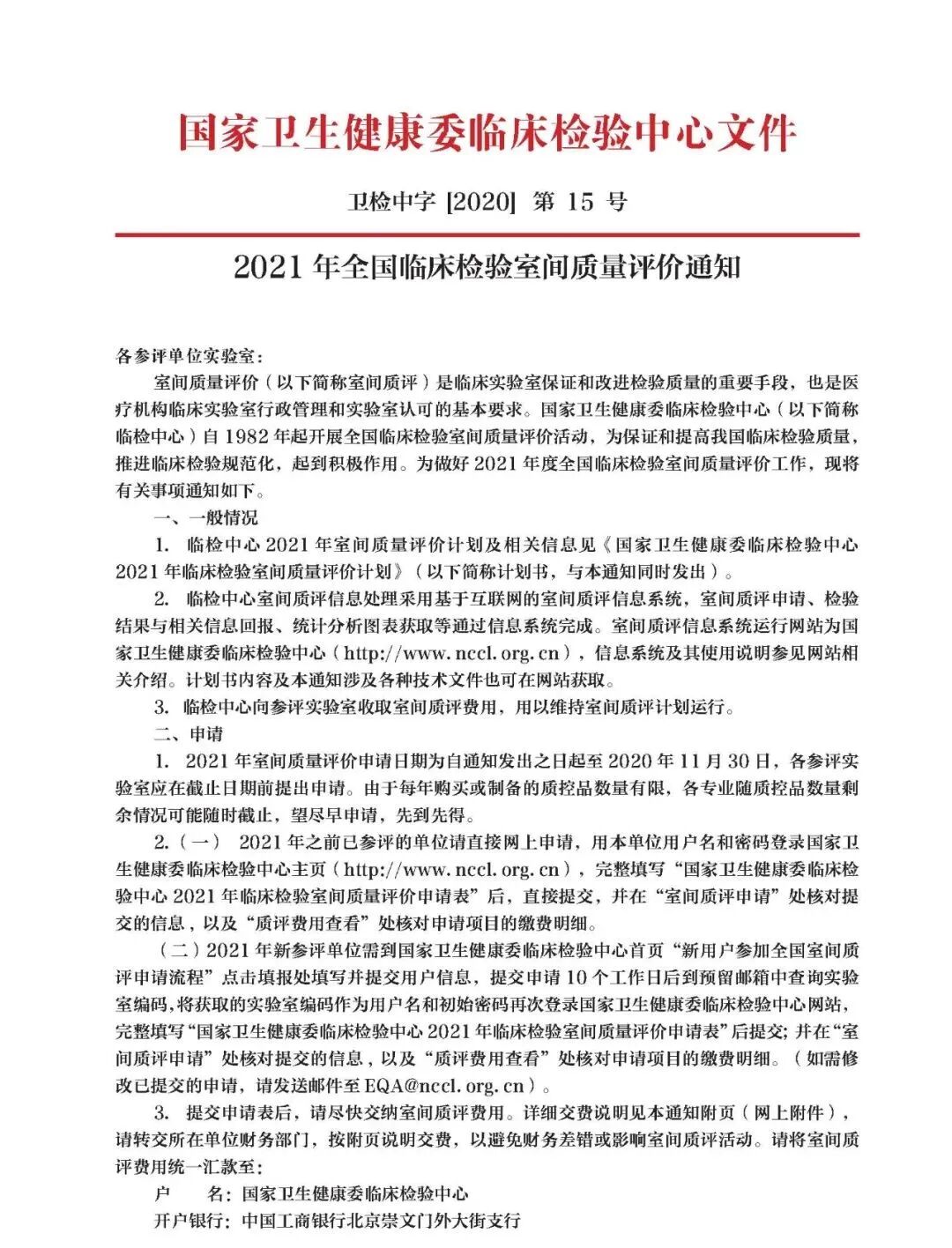 2.(一) 2021年之前已参评的单位请直接网上申请,用本单位用户名和密码登录国家卫生健康委临床检验中心主页(http://www.nccl.org.cn),完整填写“国家卫生健康委临床检验中心2021年临床检验室间质量评价申请表”后,直接提交,并在“室间质评申请”处核对提交的信息,以及“质评费用查看”处核对申请项目的缴费明细。
