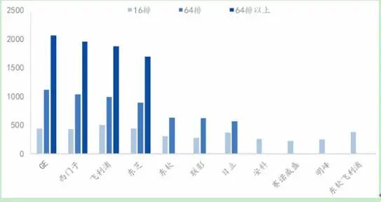 国产与进口CT存在技术代差,主要以16排CT产品为主。由于高端CT存在很高的技术壁垒,且国内缺乏核心元部件生产能力,目前高端CT产品国产品牌较少,仅东软和联影目前推出了128层CT,其他厂家主要产品仍为64层以下CT,主要为16层CT。GE、西门子、飞利浦、东芝等目前CT产品线齐全,高端产品技术优势领先,可进行例如CTA、心脏快速成像、肺部低剂量扫描等多种临床扫描功能,相比而言国产产品仍有较长的路要走。