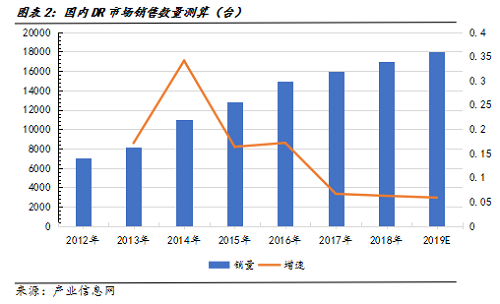 2000年以来,随着国家支持和医疗需求的推动,DR销量在2012年达7000台,且近年来年销量持续增长,2018年全年销售达17000台,按照5%~8%销量增速预测,我们估计2019年DR销量在18000台左右。