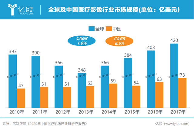面对广阔的下游市场,国产医疗影像仍然面临较大的发展潜力,2017年中国医疗影像市场规模达到511亿元(73亿美元),占全球医疗影像市场17.4%;2010年至2017年中国医疗影像市场规模的复合增长率达到6.5%,远超全球增速1.0%。