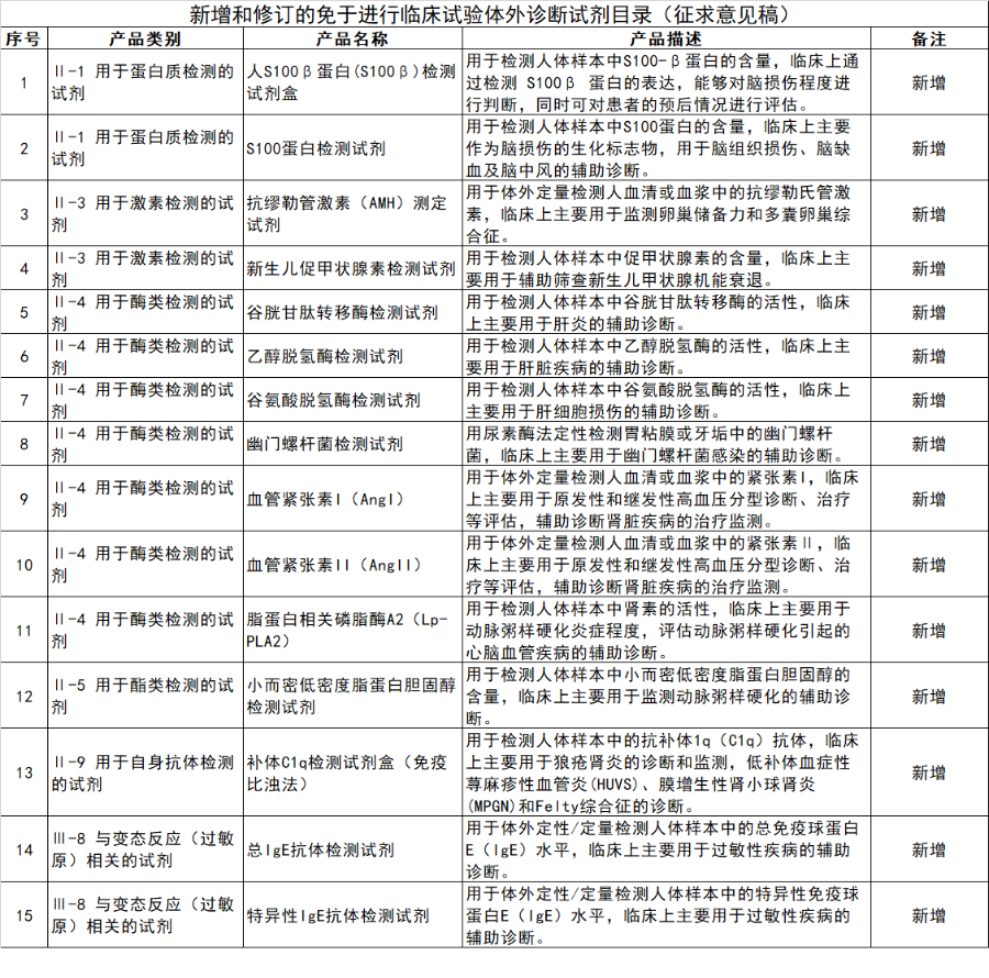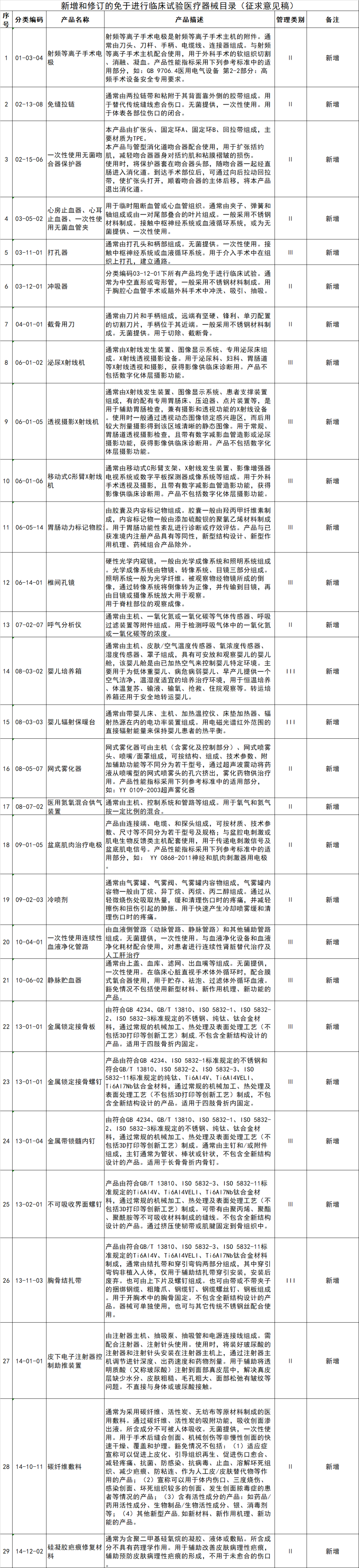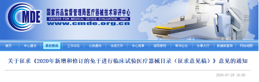 近日,国家药监局医疗器械技术评审中心发布关于征求《2020年新增和修订的免于进行临床试验医疗器械目录(征求意见稿)》意见的通知。