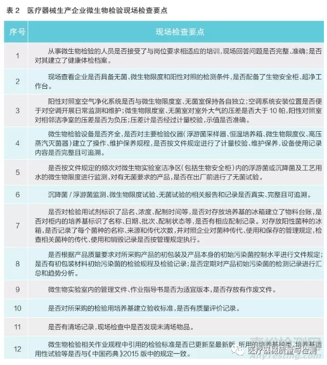 笔者针对上述常见共性缺陷项,结合自身在医疗器械行业中的从业及监管经验,就医疗器械GMP现场检查中的微生物检验归纳出12条检查要点(见表2),力求较全面地涵盖现场检查中监管人员应重点关注的内容,并为企业开展自查自纠提供切入点。