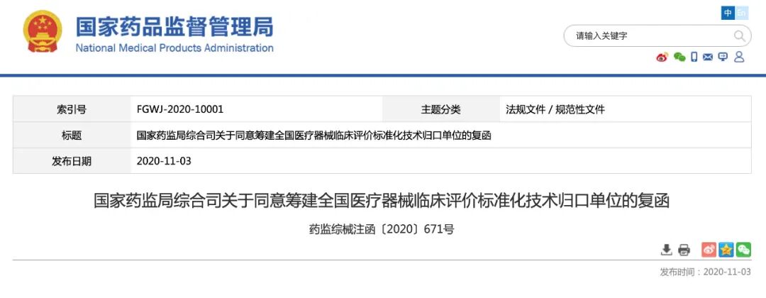你中心《关于建议同意国家药品监督管理局医疗器械技术审评中心申请筹建全国医疗器械临床评价(含临床试验)质量管理和通用要求标准化技术归口单位相关材料的函》(国械标管函〔2020〕236号)收悉。经研究,现提出以下意见: 一、根据《医疗器械标准管理办法》有关规定,同意你中心组织筹建医疗器械临床评价标准化技术归口单位。 (一)拟定专家组成方案。筹建单位按照相关方广泛参与的原则征集专家人选,并将征集专家函在本单位和你中心网站公布。根据征集情况,筹建单位与包括专家推荐单位在内的有关方面协商拟定专家组成方案。专家组成和条件参照《全国专业标准化技术委员会管理规定》有关要求。 (二)研究标准领域和体系框架。筹建单位组织有关单位和专家对归口单位所负责的专业领域进一步研究论证,加强与其他相关技术委员会的沟通,提出归口单位的标准领域和体系框架。 (三)报送标准化技术归口单位组建方案。筹建单位准备归口单位组建方案材料(见附件),于2020年11月底前报你中心审查。 (四)对外公示。你中心在组建方案审查通过后,应向社会公示归口单位名称、专家名单、专业领域、对口国际组织、筹建单位、秘书处承担单位等信息,公示期为30天。公示期满,如符合要求,由你中心将组建方案报国家药监局审批。附件: