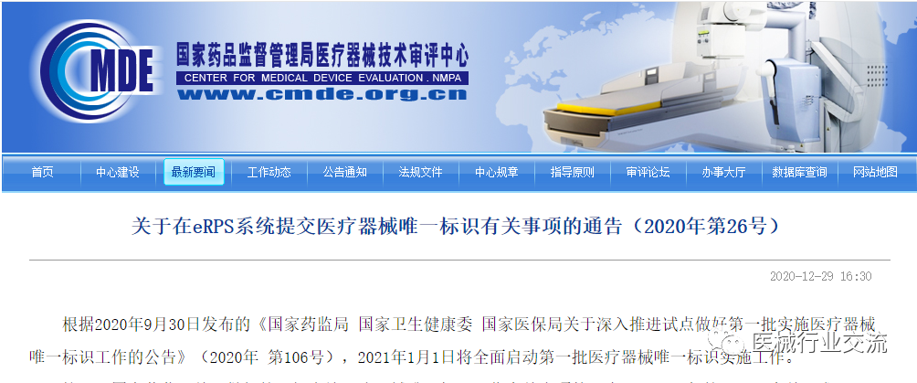 | 关于在eRPS系统提交医疗器械唯一标识有关事项的通告(2020年第26号) |